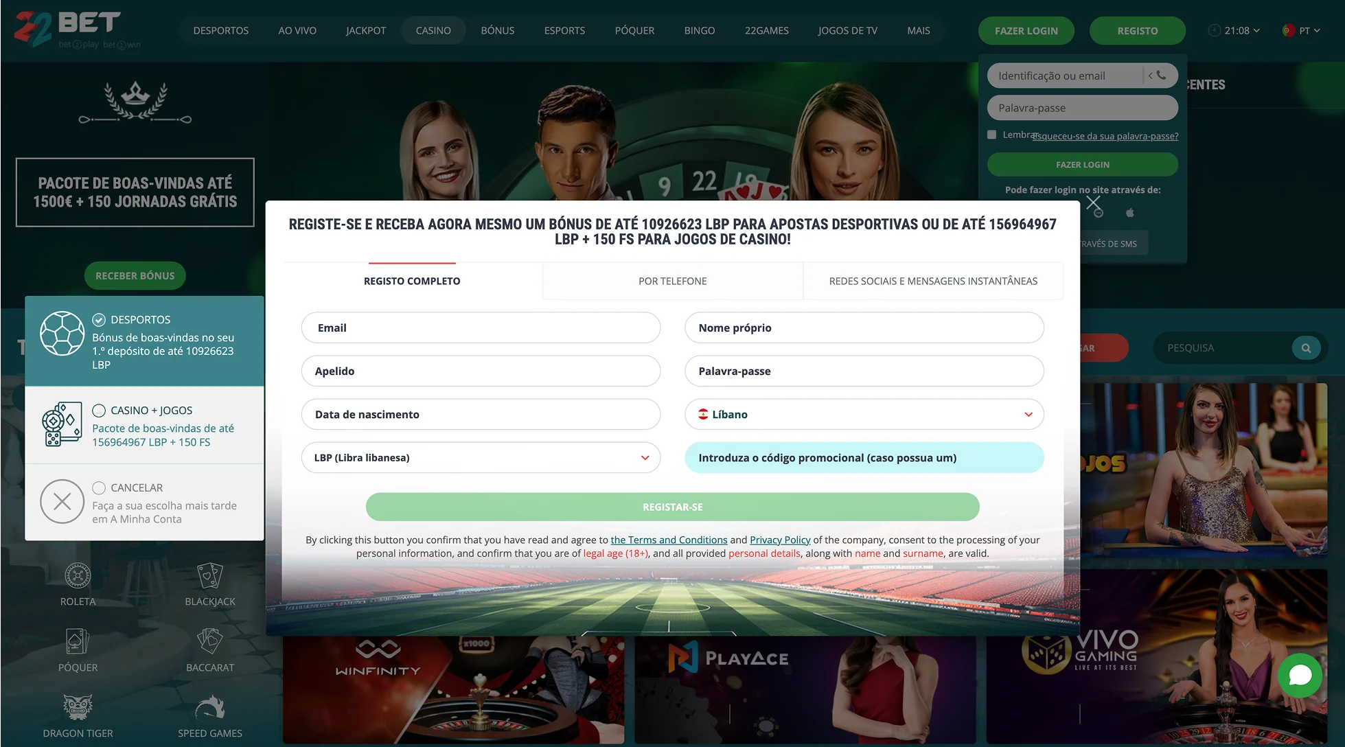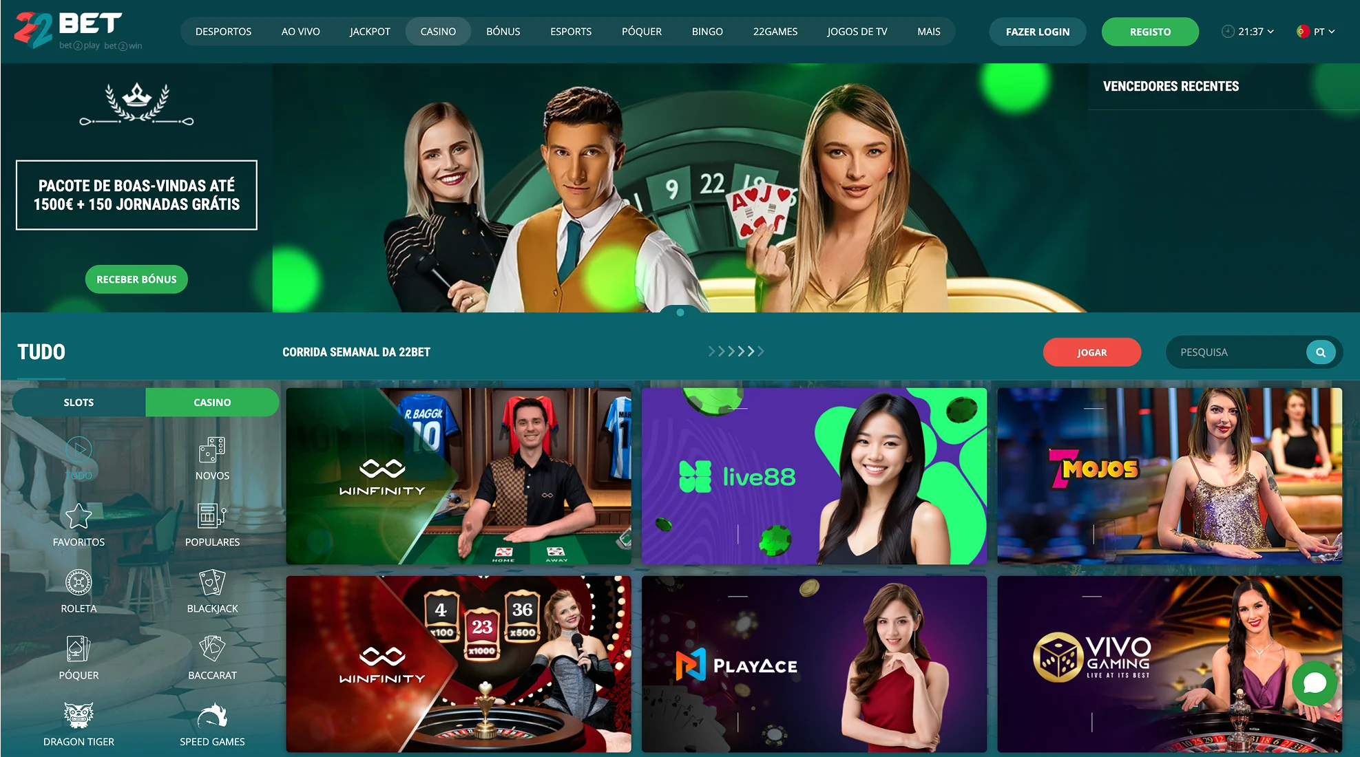 Bónus de Casino 22Bet (até 300€)