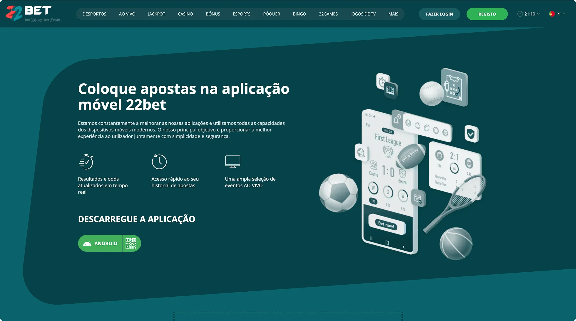É um processo seguro, desde que siga os passos: aceda ao site do 22Bet através do navegador do seu telemóvel, encontre a secção de aplicações e descarregue o ficheiro.