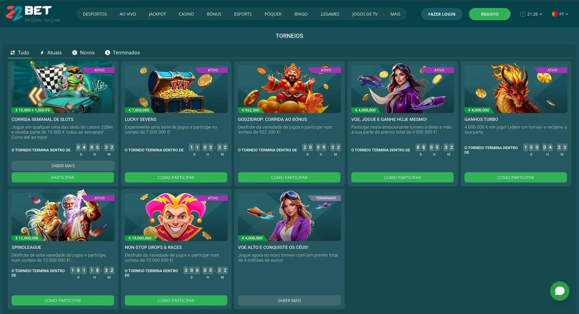 Confira as informações mais relevantes para si sobre alguns torneios famosos que encontrámos no 22Bet em Portugal hoje: