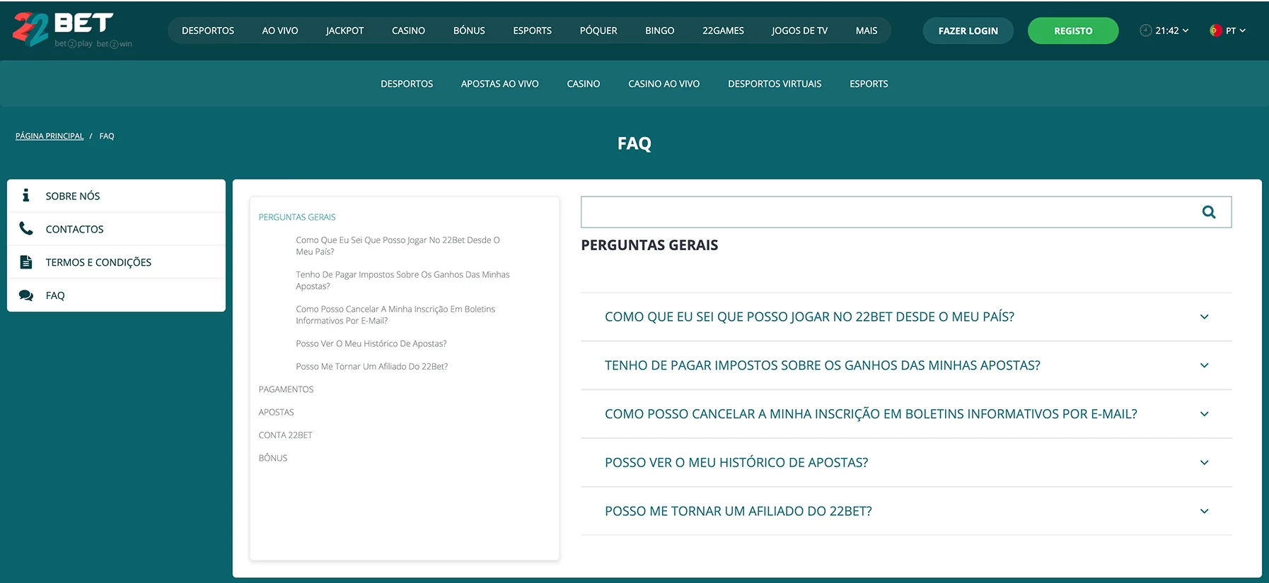 A secção de Perguntas Frequentes do 22Bet é funcional, cobrindo os tópicos mais básicos sobre registo, depósitos e bónus.