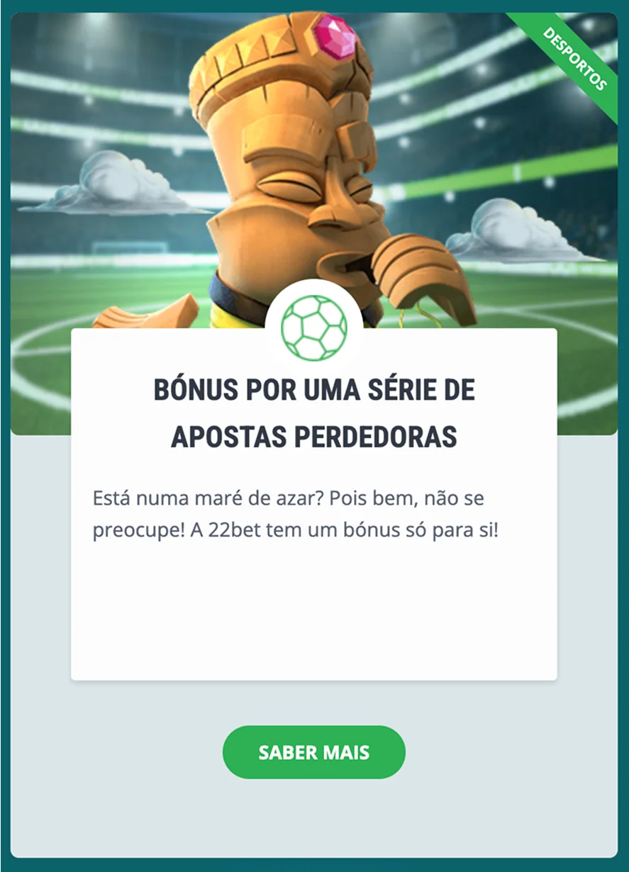 Uma espécie de "seguro" psicológico que demonstra boa-fé: se um jogador tiver uma longa série de apostas perdidas (geralmente 20 consecutivas), o 22Bet oferece pontos de bónus. É um gesto que, embora de valor modesto, ajuda a mitigar a frustração e a manter o jogador envolvido.