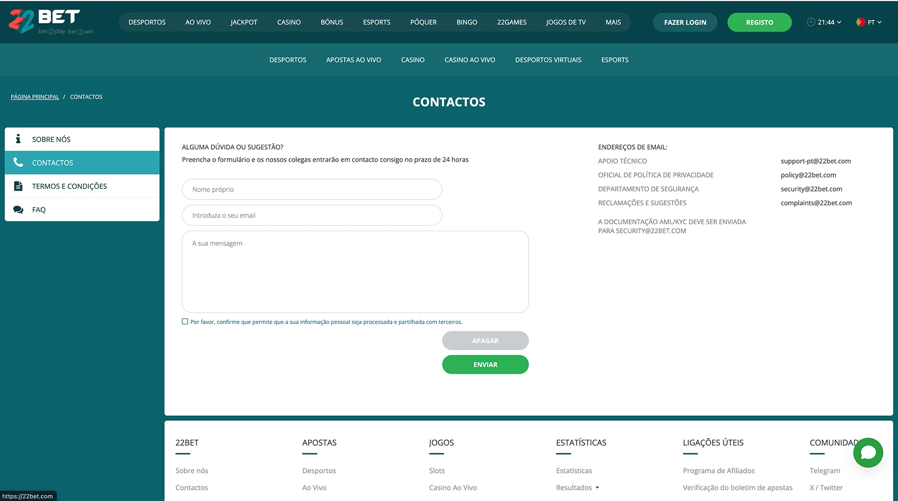 A secção de Perguntas Frequentes do 22Bet é funcional, cobrindo os tópicos mais básicos sobre registo, depósitos e bónus.